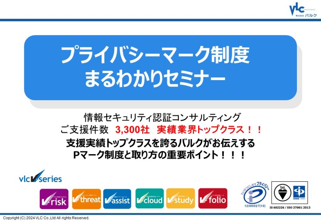 資料ダウンロード Home 資料ダウンロード一覧 「プライバシーマーク制度まるわかりセミナー」VIDEO 「プライバシーマーク制度まるわかりセミナー」VIDEO プライバシーマーク 2024年5月9日に開催されたセミナーのオンデマンド配信です 30分でプライバシーマークの全体像を理解できるミニセミナーです。 Pマーク制度と取り方の重要なポイントをご紹介いたします。 名前(漢字) - 姓 名前(漢字) - 名 名前(かな) - 姓 名前(かな) - 名 会社・組織名 部署・部門名 役職名 都道府県 <都道府県> 北海道 青森県 岩手県 宮城県 秋田県 山形県 福島県 茨城県 栃木県 群馬県 埼玉県 千葉県 東京都 神奈川県 新潟県 富山県 石川県 福井県 山梨県 長野県 岐阜県 静岡県 愛知県 三重県 滋賀県 京都府 大阪府 兵庫県 奈良県 和歌山県 鳥取県 島根県 岡山県 広島県 山口県 徳島県 香川県 愛媛県 高知県 福岡県 佐賀県 長崎県 熊本県 大分県 宮崎県 鹿児島県 沖縄県 その他(日本国外等) メールアドレス 電話番号 個人情報の取り扱いについて 以下をご確認頂き、「同意する」にチェックをお願い致します。 事業者の氏名又は名称 : 株式会社バルク 個人情報保護管理者(若しくはその代理人)の氏名又は職名、所属及び連絡先 管理者名:個人情報保護管理者 所属部署:株式会社バルク 情報セキュリティ事業部 連絡先:電話03-4500-6484 個人情報の利用目的 ① 資料提供のため ② 弊社商品・サービスのご案内のため 個人情報の開示等の請求 ご本人様は、当社に対して本件に関する個人情報の開示等に関して、下記の当社窓口に申し出ることができます。その際、当社はお客様ご本人を確認させていただいたうえで、合理的な期間内に対応いたします。 【お問合せ窓口】 〒105-0001 東京都港区虎ノ門四丁目1-40 江戸見坂森ビル 株式会社バルク 情報セキュリティ事業部 TEL:03-4500-6484 (受付時間 9:00~18:00※) ※土・日曜日、祝祭日、年末年始、ゴールデンウィーク期間は翌営業日以降対応とさせて頂きます。 個人情報を提供されることの任意性について ご本人様が当社に個人情報を提供されるかどうかは任意によるものです。ただし、必要な項目をいただけない場合、適切な対応ができない場合があります。 プライバシーポリシーに同意する